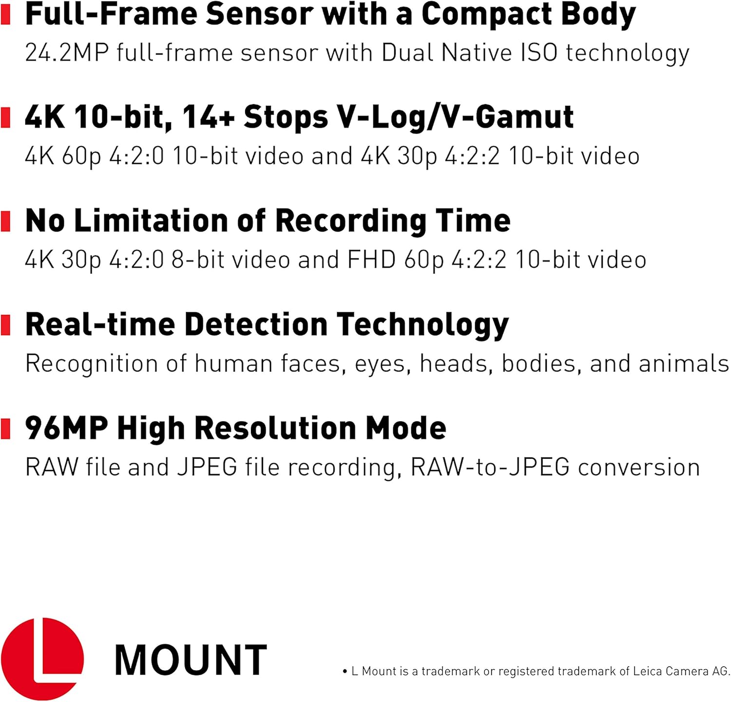 Der 24,2-Megapixel-Vollformatsensor mit Dual-Native-ISO liefert einen großen Dynamikumfang und hervorragende Ergebnisse auch bei schwierigen Lichtverhältnissen. Für Videoaufnahmen stehen 4K 60p, V-Log, HDR sowie Zeitlupen- und Zeitrafferfunktionen zur Verfügung.